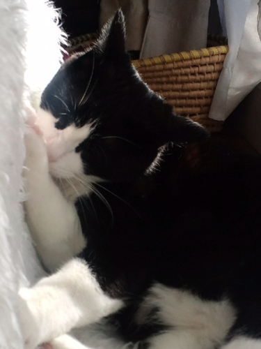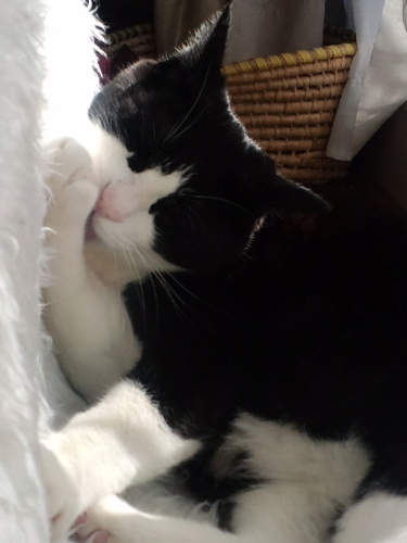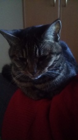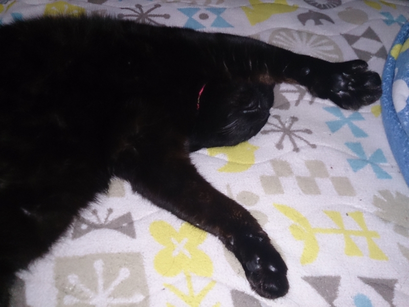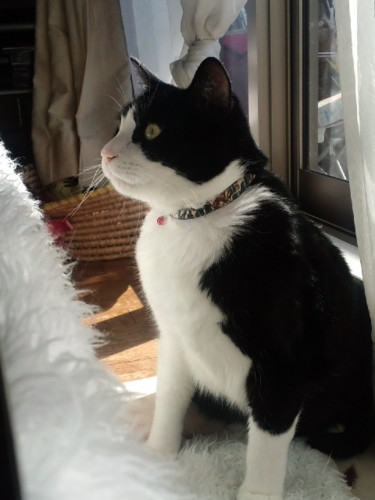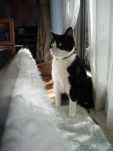 おこた(電気は入ってない)の中で寝ていたはずなのに、私が2階のベランダで洗濯物を干していたら、いつのまにか起きて2階に来て、ドアの外でミャーン、にゃーんと大声で鳴く。どんだけコドモやねん!