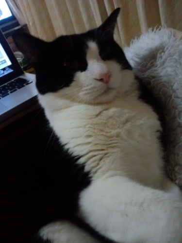 早朝に大騒ぎして私を起こしてゴハンをせしめた猫は、今は満足してイビキかきながら寝てる。チェッ!