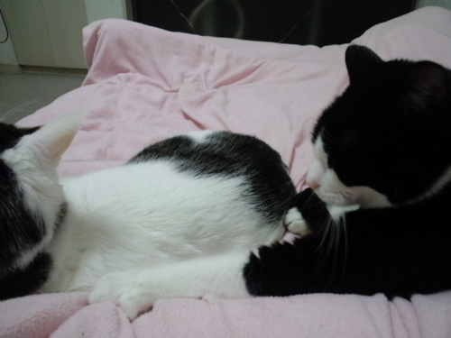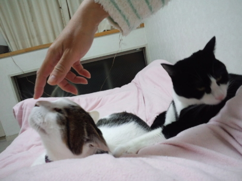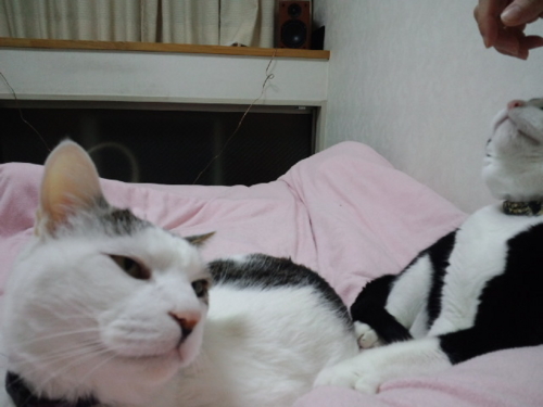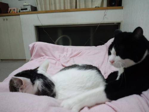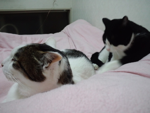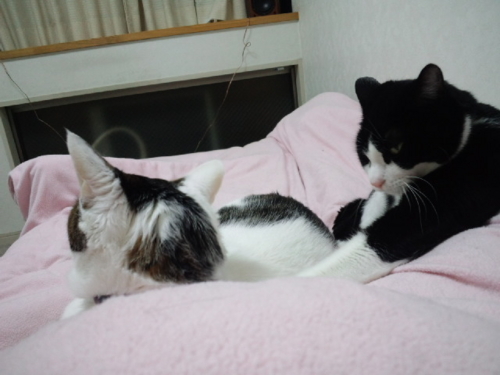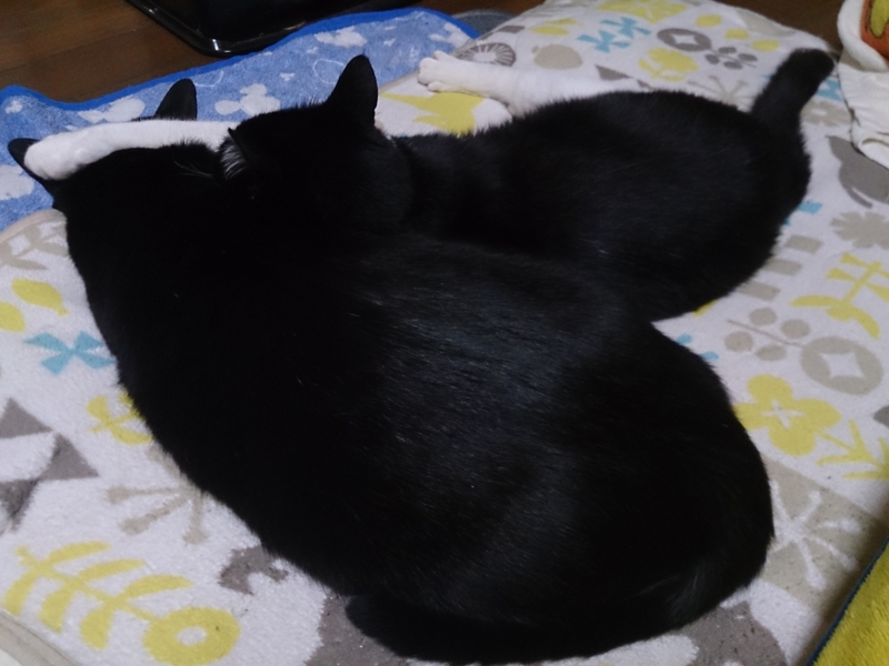 さっきこの部屋の横の窓の雨戸がガタガタンと音を立てて、私も驚いたが、寝ていたみい太もびっくりして起きた。たぶん、どこかの猫がうちの外壁に作りつけた物置に入ろうとしたけど、雨戸がまだ1枚しか閉まっていないので、隙間が狭くて入れなかったんだろう。(2枚とも閉めると、戸袋の隙間ができてそこから入れる)