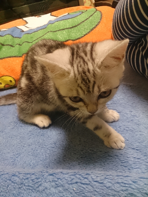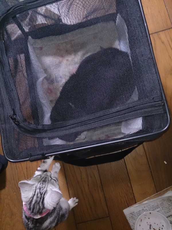 昨日買ってきたベッドにまったく入ろうとしないので、試しにいつものスツールの上に置いてみたら、ちょっと入ってみる気になったらしい。