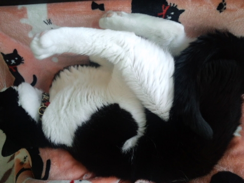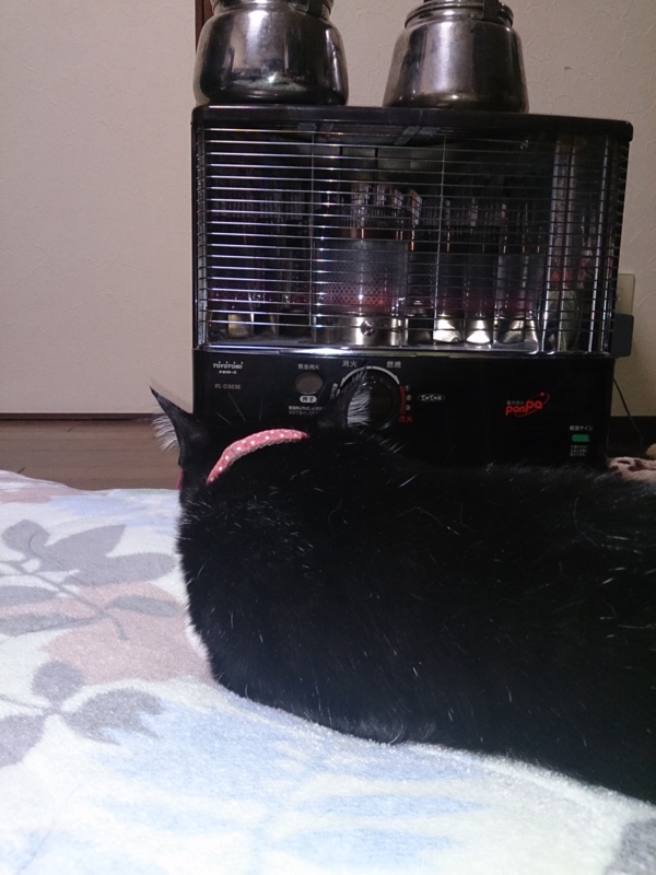 外出から戻って、めずらしく猫が迎えに出て来ないので、また2階の棚で寝ているのかなと思ったら、なんと寝室で台の上に畳んで積んでいたお布団の上から半纏やパジャマを引きずり下ろしてちゃっかり…