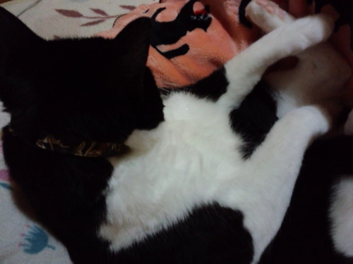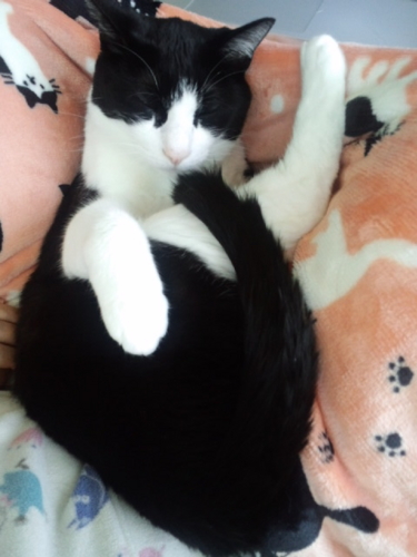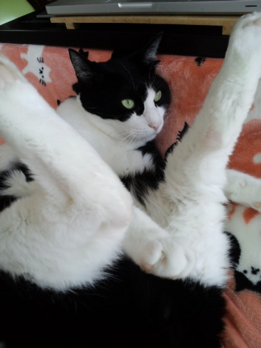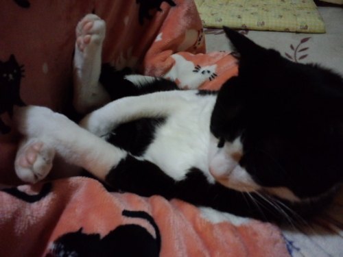 ゴソゴソゴソとおこた(さすがに電気は入れてない)の中にもぐっていったと思ったら、こたつ布団と中掛け毛布の間に挟まって落ち着いていた。