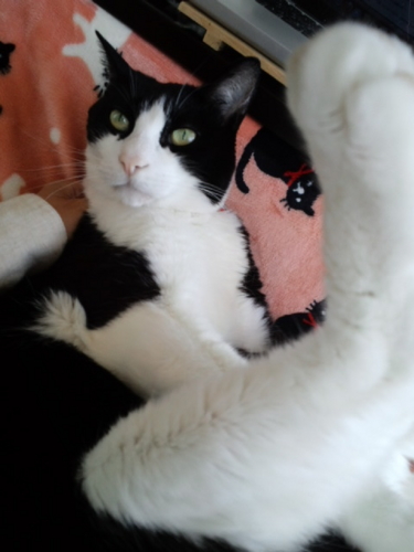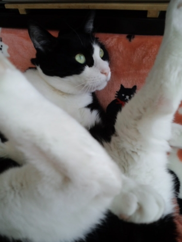 キャットタワーの最上段にいるときに私が通りかかると大はしゃぎ