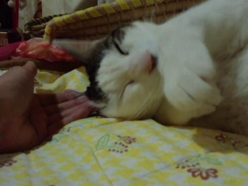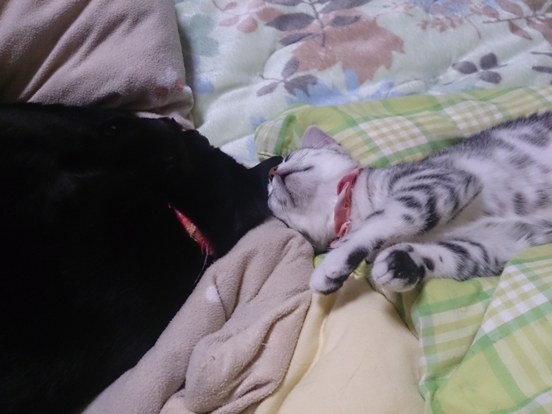 昨日から義母が来ていて少し環境が変わったせいか、朝起きたら2匹でわたしのベッドの上で寝てました。