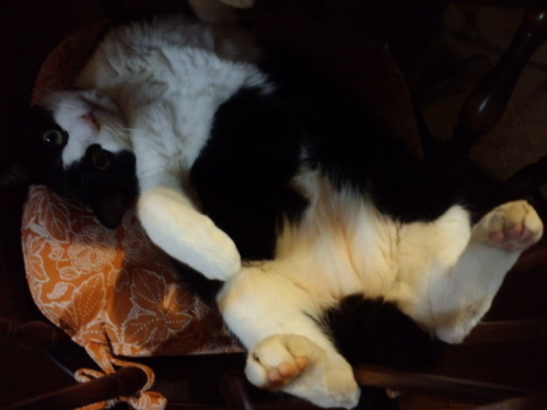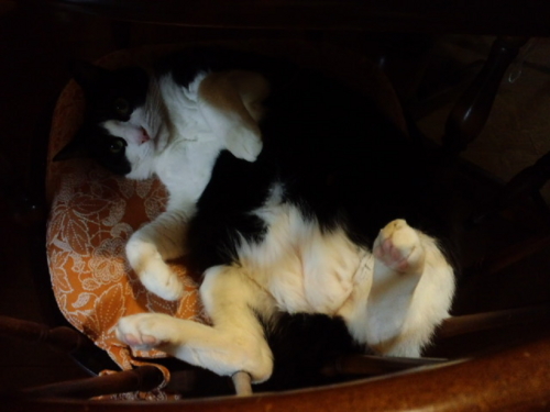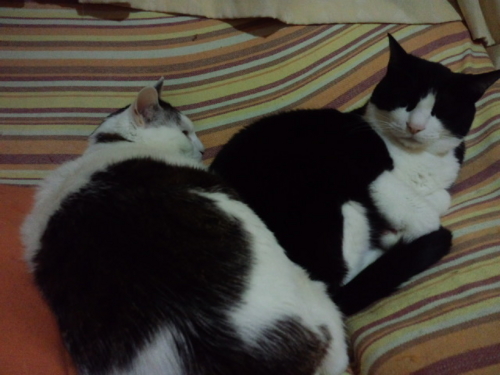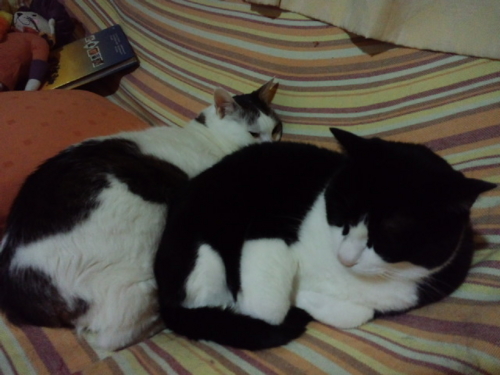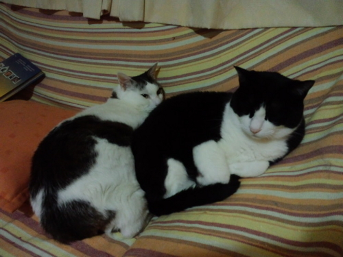 眠そうなのに落ち着かずうろうろしているので撫でていたら、膝の上に乗ってきていつものように胸にもたれてようやくウトウトし始めた。そうなると私も立てなくて、仕方なく一緒にうとうとしていたけれど、ごはんの支度を中断したまま。お腹すいたよ。