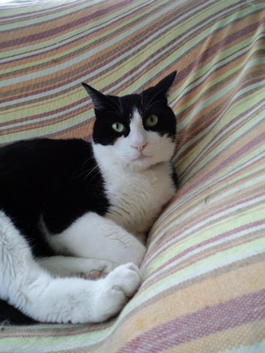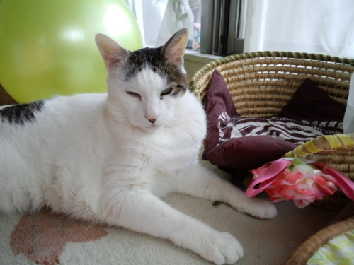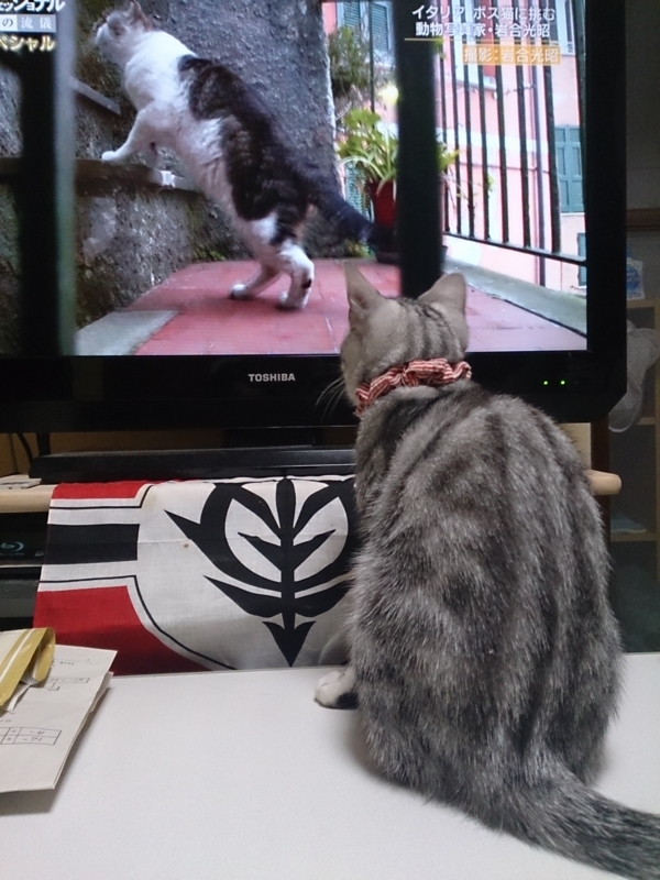 さっき私が起きてきた時、いつも寝そべっているあたりにも、隣の部屋の本棚の上にも見当たらなかったので、たぶんまた2階なんだろうと思って雨戸を開けていたら、どこからともなく猫が走ってきて飛び出した(すぐに捕獲した)が、その時もテーブルの真下だったのでいるのに気づかなかったのかな。
