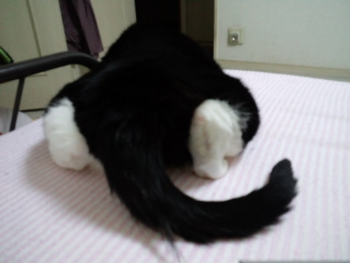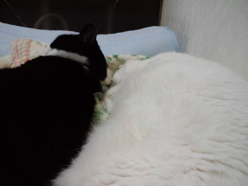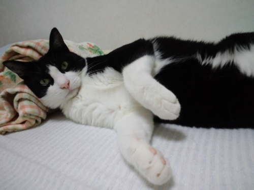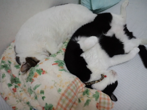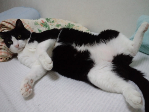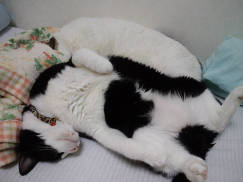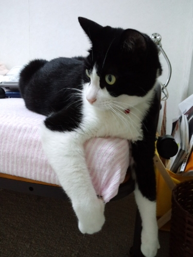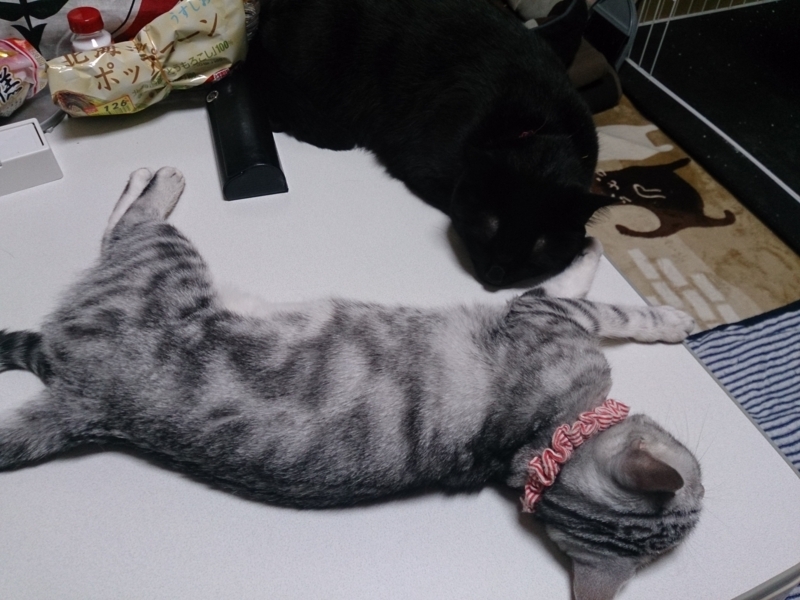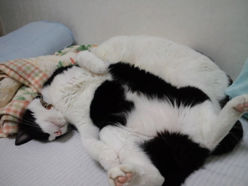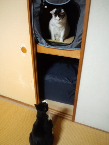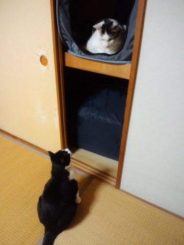 最近はすっかり立て掛けたマットの隙間で寝るのにハマったらしく、マットを敷いたままにしていると何か文句言いたげに人のまわりに来たり、あきらめたように敷居付近で寝そべったりしていて、私がお布団を片付けてマットを立て掛けると待ちかねたようにやって来て入って行く。
