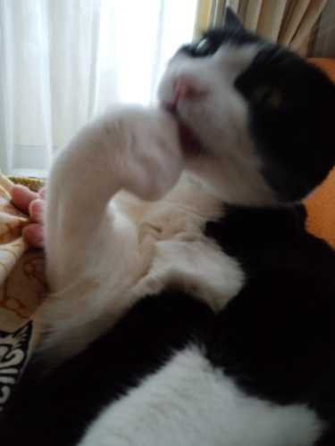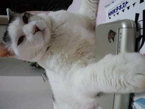 布巾を洗って干そうと2階へ上がり、ベランダに出たと思ったら下の方からうちの猫らしい声。…と思っているとすぐに2階の部屋のドアの外で「みや〜、みや〜」と大声で呼び鳴きしている。