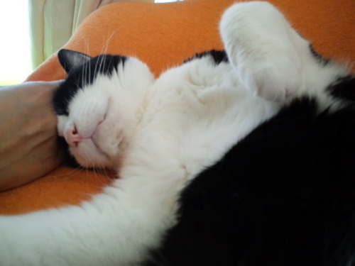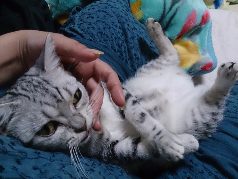 最近、私が寝ようとベッドに入って本を読んでいると、間もなく必ずやって来て胸の上に寝そべって撫でてもらってごろごろ言ったり、しばらくウトウトしたりしてまたどこかに行ってしまうのが習慣になっている。そうやって胸の上に寝ている時に、ぴゅーっと手を伸ばして私のあごのあたりを触るのが何だかとても可愛くて、撫でながらによによしてしまう。