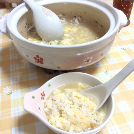 卵雑炊に梅じそを添えていただきます。