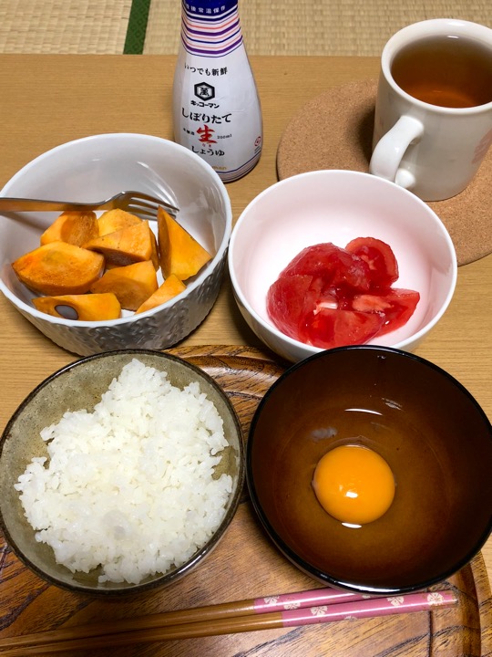 昨日ランチを食べたお店で野菜と果物を買ったら、生卵を2ついただいたので卵かけご飯にしました。
