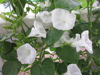 今朝は雨の中のオーストラリヤ朝顔です。濡れているから摘めないや。立派な種になーれ!