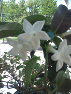 今日も32度の予報。けれど風があるので涼しく感じる。朝のうちに花に水を。トマトとキュウリの収穫。言い香りのジャスミンが咲いていた。(だと思う)