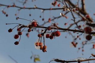 大喜びで写真撮りに裏庭に行ってみたけれど昨年のように青空もなく、枝に乗った雪もなし、さらさら降る雪のように情緒がない。