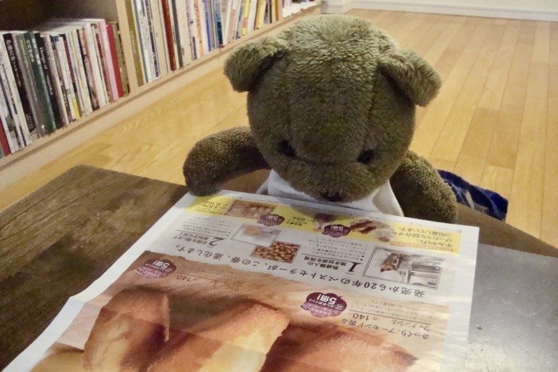 (シャトレーゼのちらしを熟読するくまちゃん。名前はくまぽー)