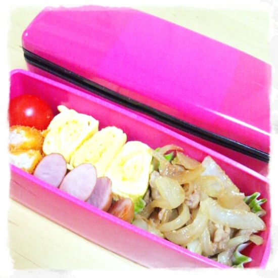 かにかま・ソーセージ・卵焼き・ミニトマト・生姜焼き風(豚肉・玉ねぎ)