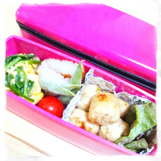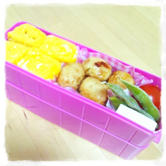 ハムちくわ(ちくわに入れるものがなかったので無理矢理突っ込んだ)・豚の生姜焼き風・ミニトマト・枝豆(自然解凍)・ネギ入り卵焼き