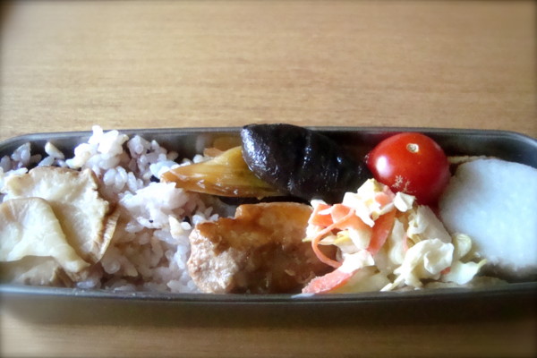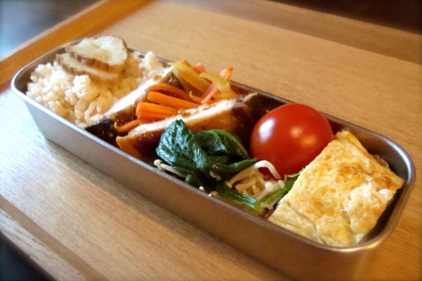 はんぺんの野菜はさみ焼き、豚肉のきのこ巻、里芋の煮物、ほうれん草の胡麻和え、プチトマト、そしていぶりがっこ弁当〜
