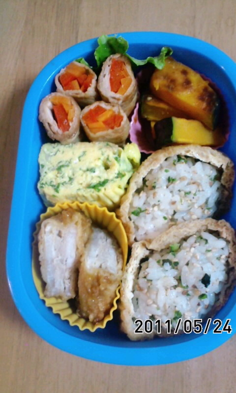 若菜と小魚おにぎり、空豆とミニトマト、かぼちゃサラダ、鮪の竜田揚げ、かにかまチーズ春巻き