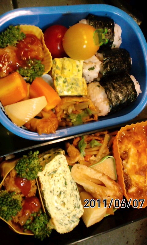 おにぎり、ミニトマト、青海苔入り卵焼き、稲荷に入ったきんぴら(冷食)、肉団子の煮たやつ、人参、筍、竹輪の煮物、夫の弁当にだけシェパーズパイ