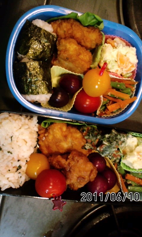 おにぎり、唐揚げ、ポテトサラダ、隠元と人参のきんぴら、ミニトマト、アメリカンチェリー、(夫)磯部揚げ
