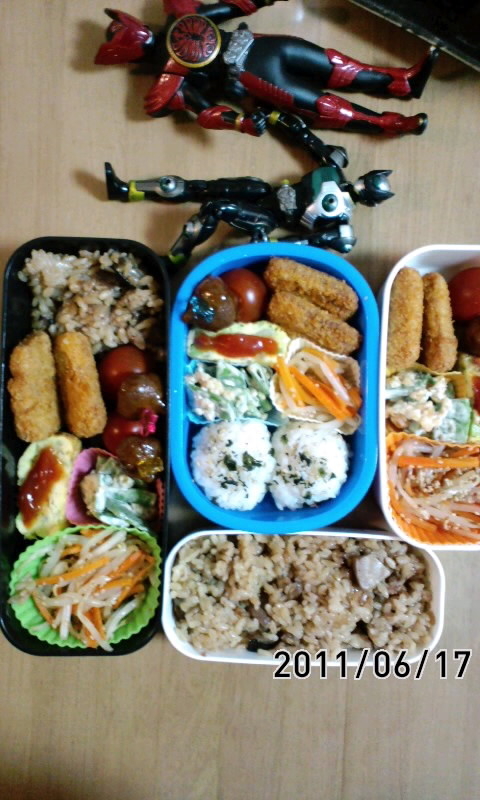 ミニトマトとミートボール、人参ともやしのナムル、モロッコ隠元のピーナッツ合え、空豆と玉葱入りオムレツ、冷食のハムカツ(長男)ワカメおにぎり、(大人)炊き込みご飯