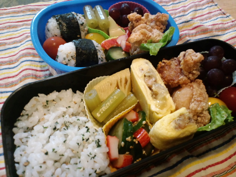 おにぎり、蕗と筍の煮物、きゅうりのごま合え、から揚げ、デラウェア、ミニトマト、(夫だけ)刻んだ肉じゃが入り卵焼き