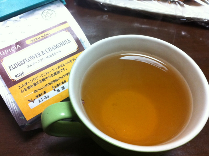 カモミールにジンジャーとドライアップルをブレンドですってよ。香りが甘い(´ε`)♪後味に辛さを感じるのはジンジャーかしら。