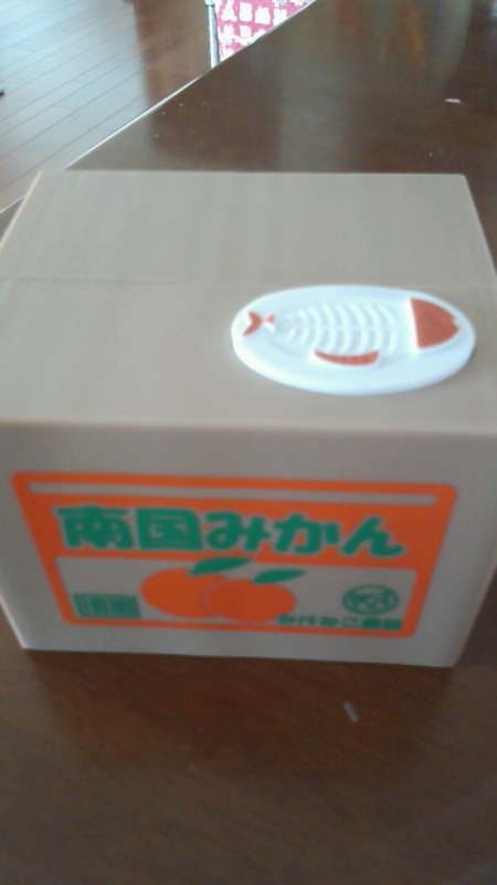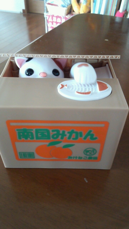 お皿にお金を置くと、箱の中から「ニャーン!」とネコが顔出してお金を手招きでさらっていく貯金箱です