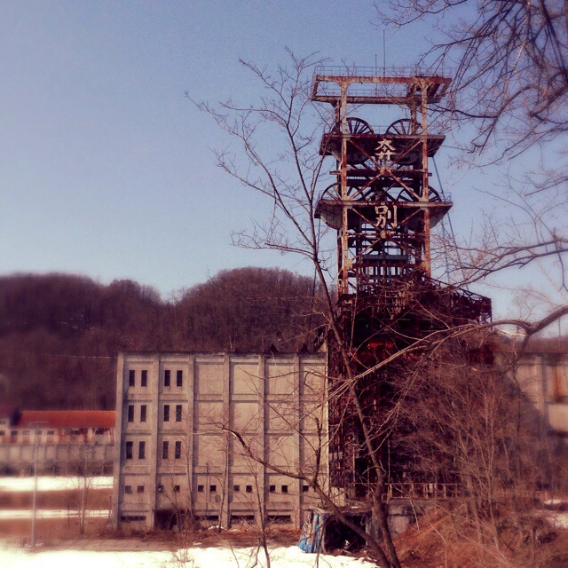 閉山に伴う作業中に爆発事故があり、櫓の下部はグニャリと曲がったままだ。