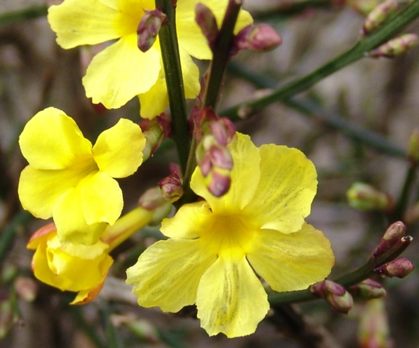 近所の石垣に、「季節はずれの黄梅」の花がたくさん咲いていて、びっくり。