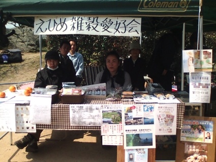 えひめ雑穀愛好会。美味しい雑穀ご飯をいただきました。玄米3種、麦3種、ハトムギ、黒千石大豆、緑豆、茶豆、小豆、黒大豆、ほか雑穀18種入ってるそうです。