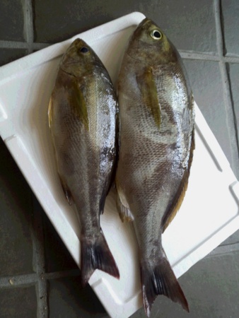 今釣って来たからとイサキの大小2匹と鰺を2匹いただきました。