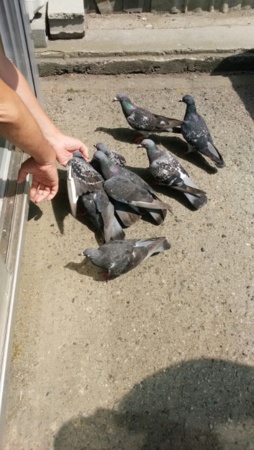 いつもいるハトは2~3羽なのに、前の方が中に入るとどこからか沢山集まってきました。