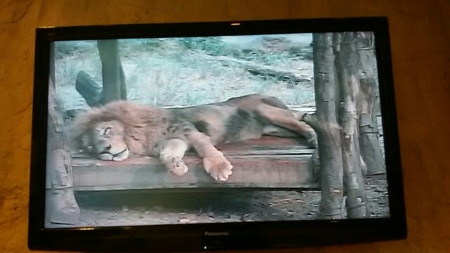 オスライオンが高い場所のガラス張り窓から見られる場所でモニターに映されていました。