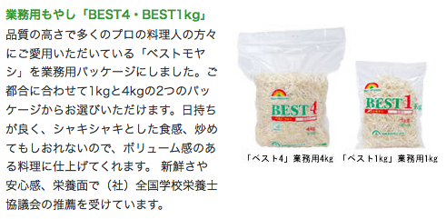 業務用だと、4kg入りもあるようですね。中身は成田食品の「ベストモヤシ」だから、商品名は「ベスト4」(ベタな)。