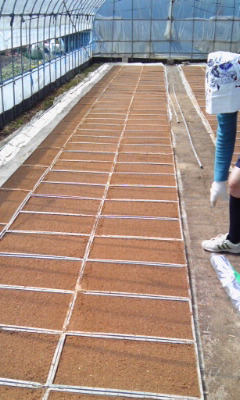 苗箱に撒いた籾を、二列ずつビニールハウスふたつに並べる。