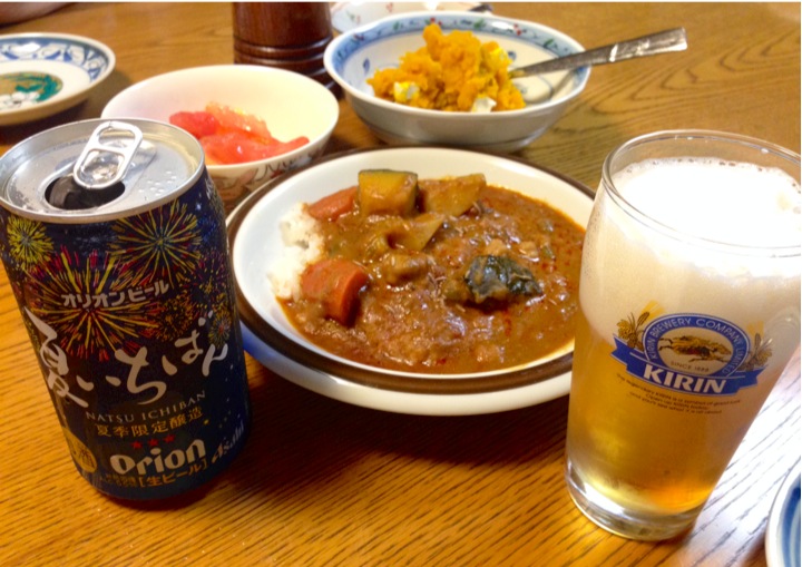おともは毎度おなじみ中村屋のベジタブルカレーと、カボチャとクリームチーズのサラダです。