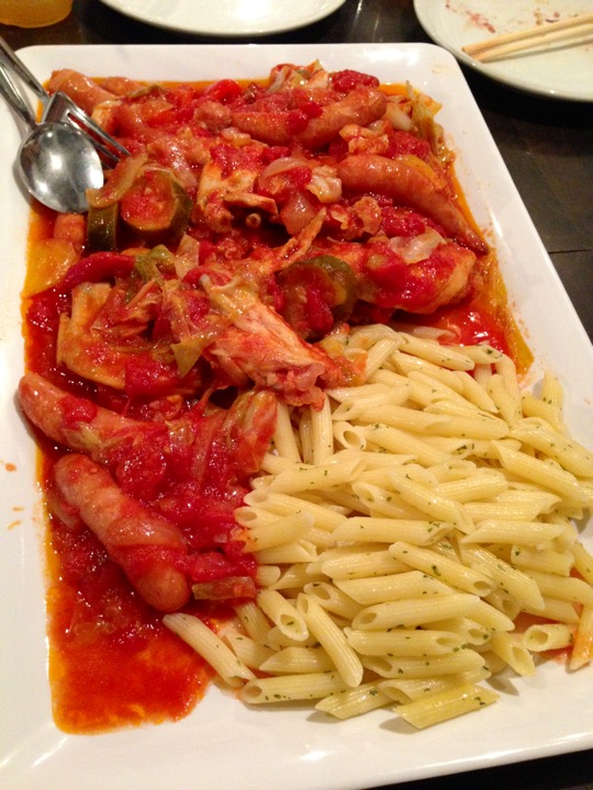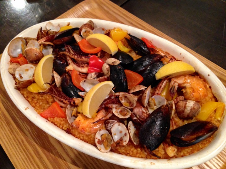 (鶏肉、豚肉、牛肉が出て来てシメがシーフードパエリアだった。)