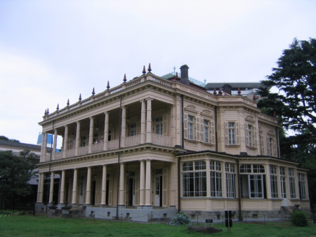 でるかどうかはわかんないけど、上野池之端の岩崎邸を貼っておきます。ジョサイア・コンドルが東大の建築学科に招かれてたときに岩崎家が建てさせた建物です。主にゲストハウスとしてつかってたはず。この洋館の隣に屋敷があって、そこに普段はすんでました(弥太郎のまごの世代かな)。