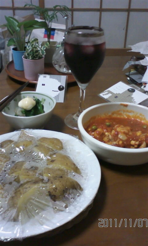 鶏のトマト煮。もやしとほうれん草のお浸し醤油マヨネーズ味。じゃがいものレンジで蒸かしたの。