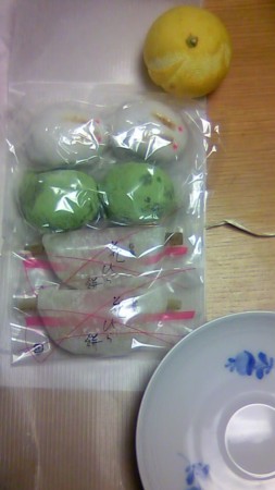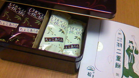 おやつというか朝のデザート(あさごはんは牛蒡とお揚げの炊き込みご飯に竹輪入りひじき煮)。今日が賞味期限の羽二重餅と、昨日いただいたチョコがけあられ。あられというより、おかきサイズ。