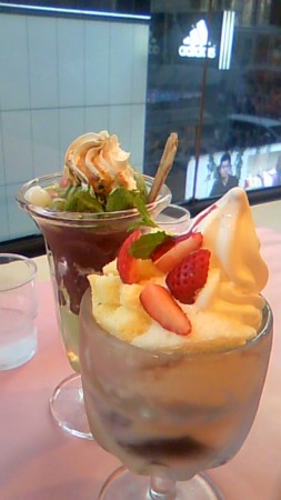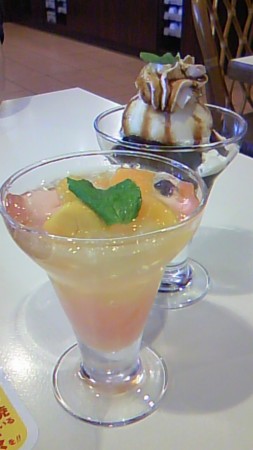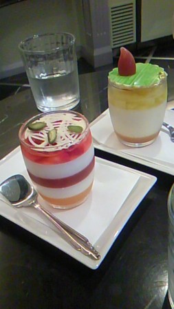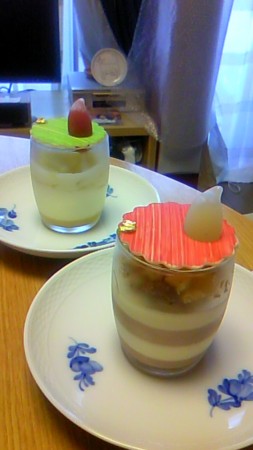手前:メープルポワール(ミルクチョコのババロア、メープルとマスカルポーネチーズのクリーム、洋梨のシナモン風味のマーマレード)