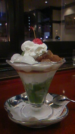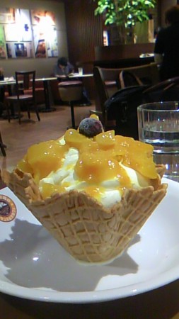 奥:キャラメルエキゾチック(トロピカルな味に仕上がったキャラメルソース、バニラのババロア、パインをライムでマリネし、最後にいちごのソースをスポイトからかけて)