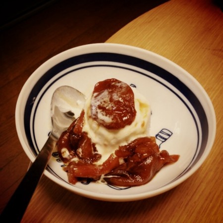 りんごのカラメル煮ができたので、少しだけアイスにかけて食べてます。風味付け、レモン汁かコアントローどっちかでよかったな。