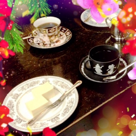 レアチーズケーキとジャスパーウェアの黒で飲むコーヒー。ピンクや水色は喫茶店でよく使われているけど、黒の実物を見たのは初めて。ほかのみんなのカップも、ジノリや大倉陶園など麗しかったです。