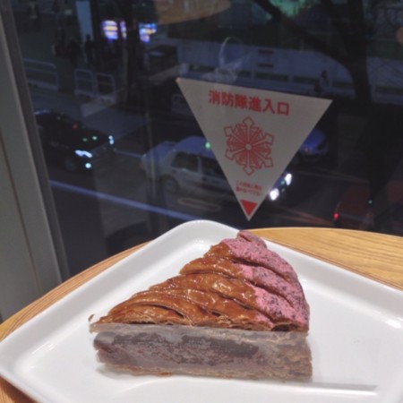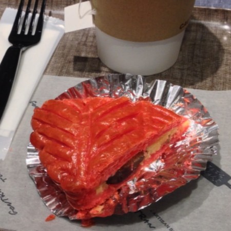 遅いお昼兼、おやつ。生姜味だという赤いガレット・デ・ロワ! 栗入りです。パンは春菊のキッシュと紫蘇入りソーセージ。紅茶はメープルの香りの。