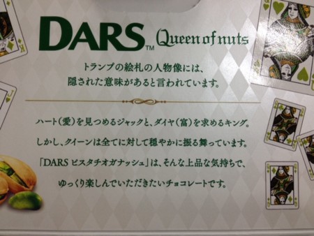 ダースのピスタチオ味。蓋の裏に書いてあること読みながらツッコミ。これ、見つめるマークでも変わるよね。棍棒由来のマークを見つめるクイーンは西太后かもしれないし、ハートのキングは王位を捨てた誰かさん、ダイヤのジャックはジェイムズくんかな?