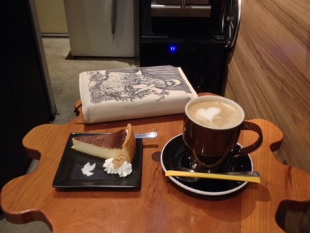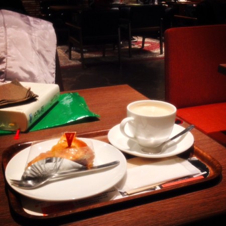 カラメル炊きアップルパイとカフェインレスミルクコーヒー。パイはりんごがカラメル炊きであるのもさることながら、底のパイ皮とりんごの間にスポンジケーキを噛ませてないのがいいのです。