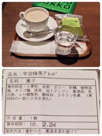 カフェインレス・コーヒーと抹茶パウンドケーキ。ケーキの原材料に「ゼリー」ってあって困惑。ゼリーって原材料より製品名なんじゃ?